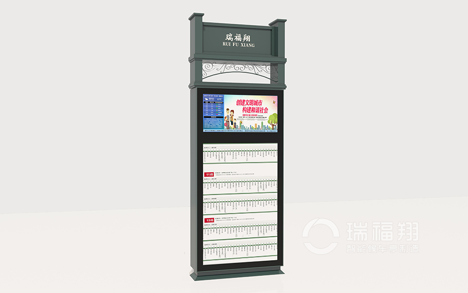 智能公交电子站牌配套在公交候车亭沿线站点位置,主要功能有公交线路信息、车辆位置信息以及车辆运行状态、监控系统、信息发布系统、触摸交互系统、一键报警求助、照明系统、TTS语音、散热系统等组成。
